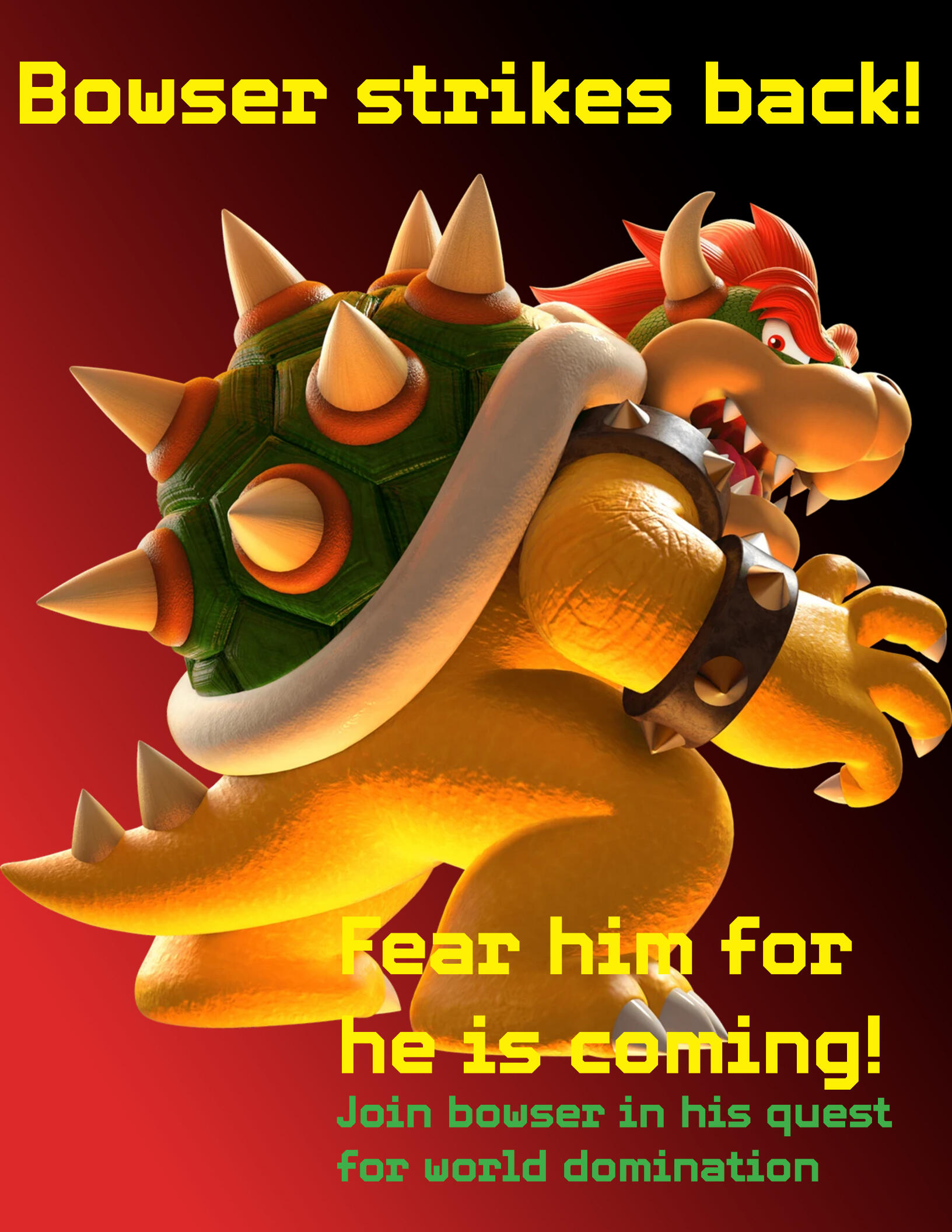 Typography: Stacked, color-coded fonts differentiate urgency ("Fear him for he is coming!") and call-to-action ("Join Bowser in his quest for world domination").