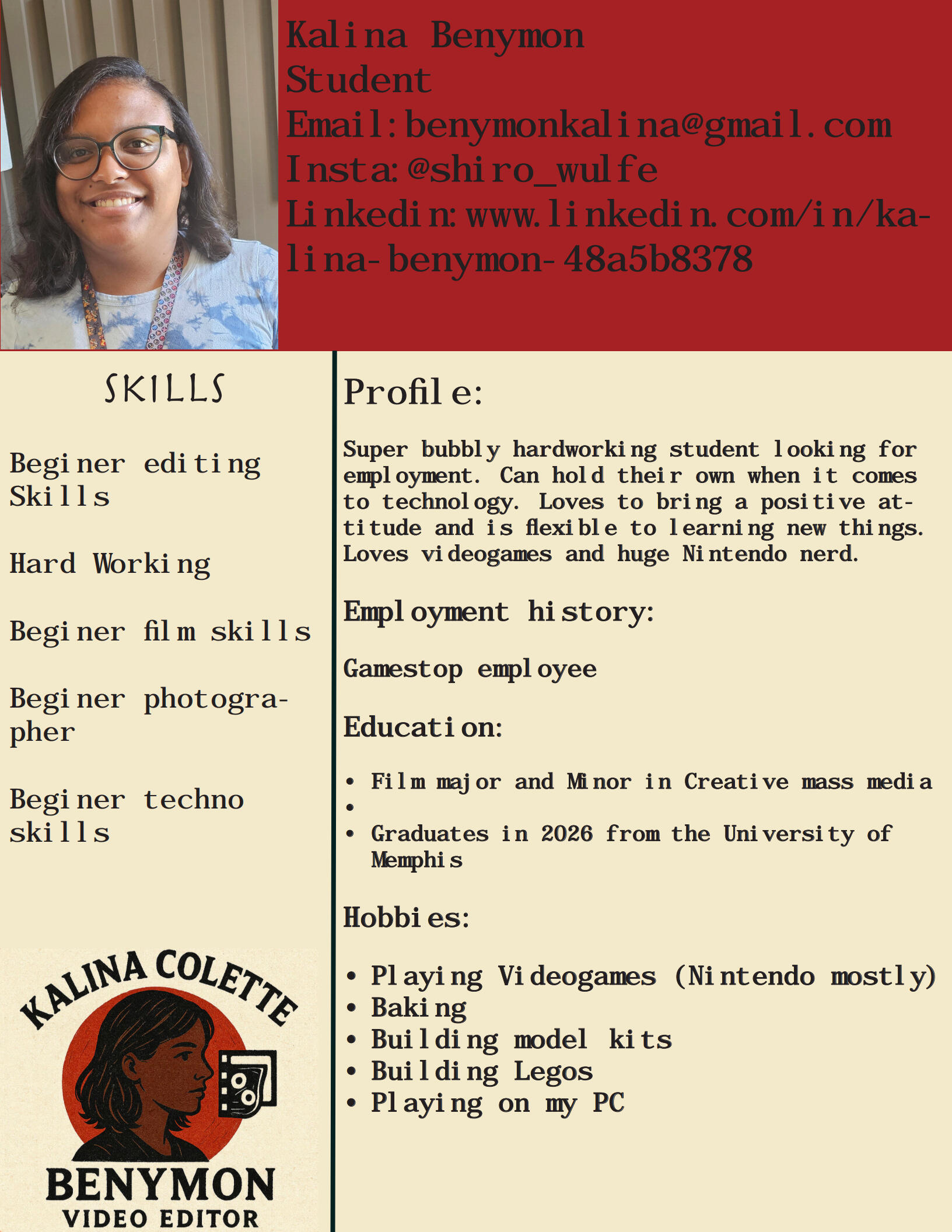 This hand-drawn, vintage-inspired logo features a side profile of Kalina Colette Benymon, symbolizing focus and creative vision. Framed by a bold red circle reminiscent of a rising sun or spotlight, the logo blends traditional ink-style illustration with modern visual storytelling.To her right, a stylized film reel and editing interface icon subtly conveys her craft — video editing — while the bold serif text beneath, “BENYMON | VIDEO EDITOR,” anchors the brand with clarity and confidence. The overall palette and textured background echo themes of handcrafted work and timeless creativity.