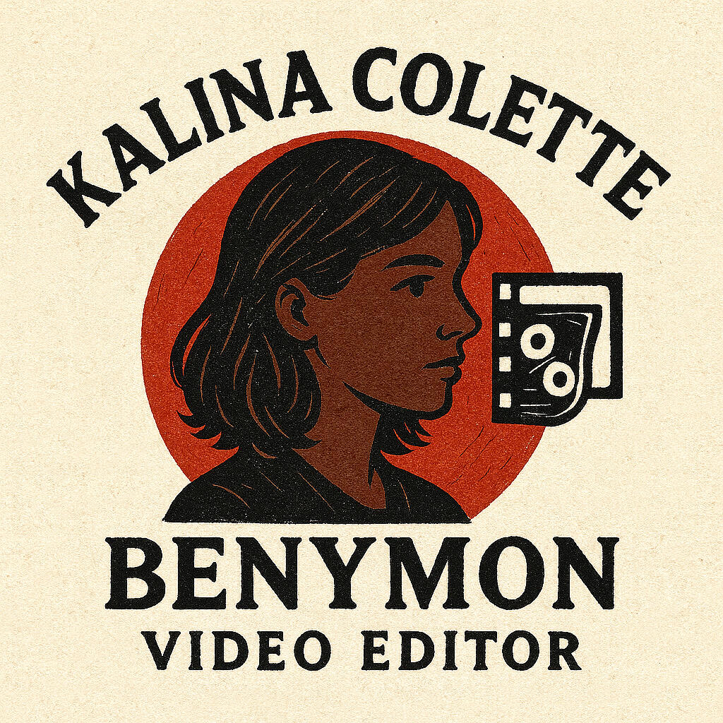 This hand-drawn, vintage-inspired logo features a side profile of Kalina Colette Benymon, symbolizing focus and creative vision. Framed by a bold red circle reminiscent of a rising sun or spotlight, the logo blends traditional ink-style illustration with modern visual storytelling.To her right, a stylized film reel and editing interface icon subtly conveys her craft — video editing — while the bold serif text beneath, “BENYMON | VIDEO EDITOR,” anchors the brand with clarity and confidence. The overall palette and textured background echo themes of handcrafted work and timeless creativity.
